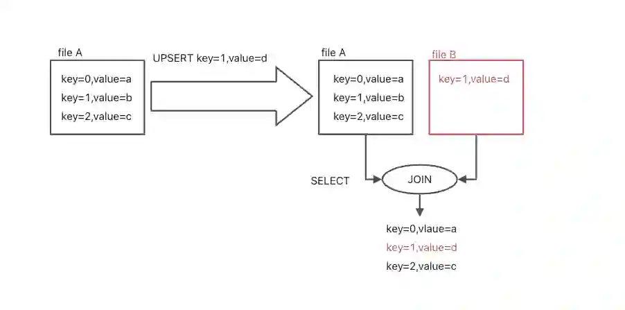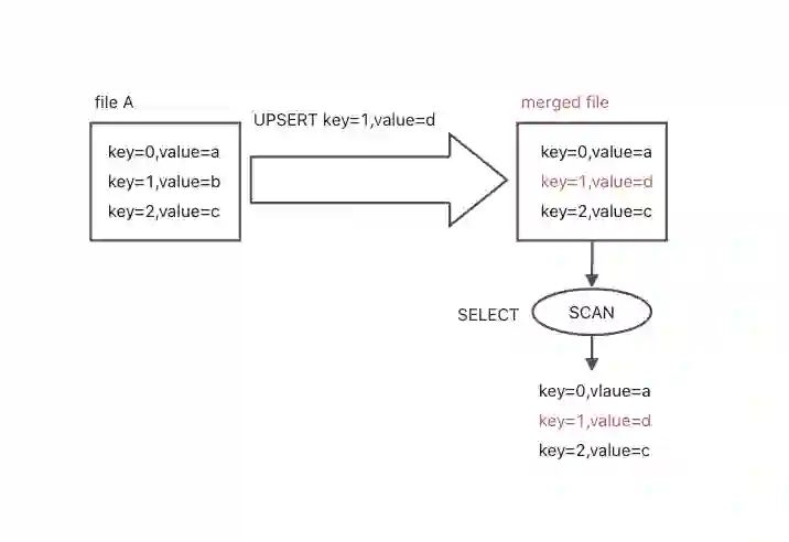 性能最高的实现方式是写入时APPEND ONLY不断写入新文件,在查询时进行数据逻辑合并(Merge on Read)。但这种对查询的性能打击是致命的,每次查询要多个版本的数据join过才能获取到一行最新的值。