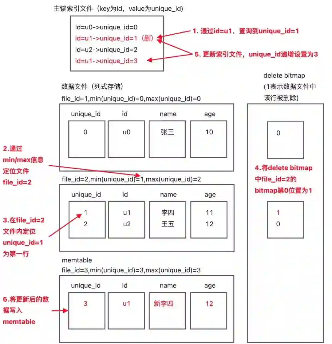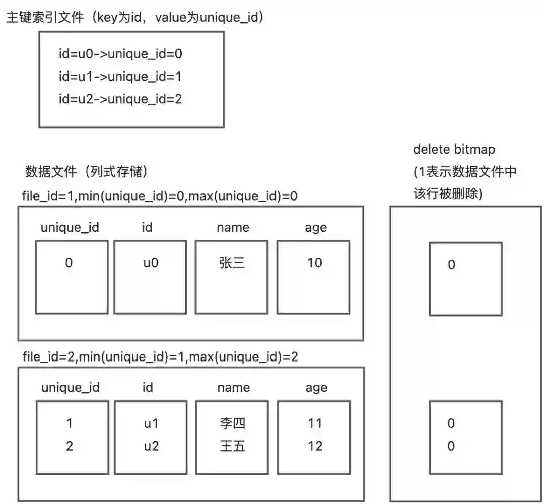 第三种是delete bitmap文件,每个file id对应一个bitmap,bitmap中第N位为1表示file id中的第N行标记为删除。delete bitmap在列存模型下,相当于是表的一列数据。Update时只刷新bitmap信息既保留了Merge on Write对查询性能几乎零破坏的优点,又极大降低了IO的开销。