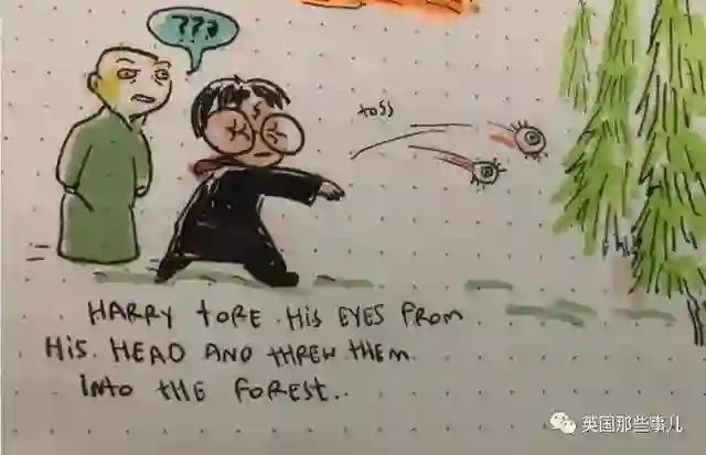「哈利感觉到伏地魔站在他身后。他感到一阵强烈的过度反应。哈利瞬间把自己的眼睛从头上撕扯下来,丢到森林里。伏地魔对着哈利扬了扬眉毛,不过此刻他当然什么都看不见。