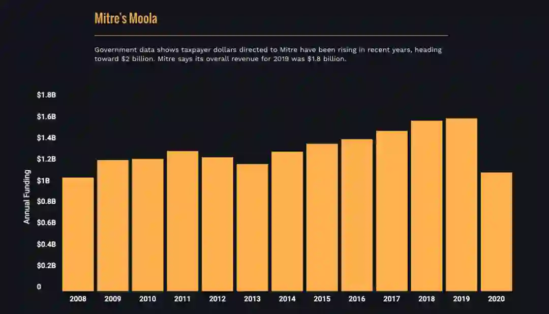 政府数据显示,最近几年,越来越多的纳税人资金流向了Mitre,大有接近20亿美元的趋势。Mitre回应说,2019年,公司的总收入为18亿美元。