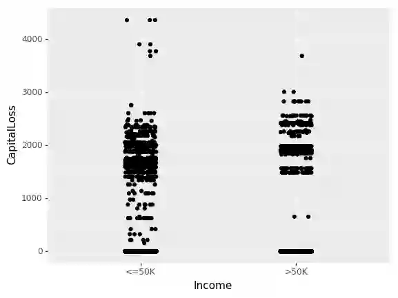 (ggplot(df_train_set, aes(x="Income", y="CapitalLoss"))+ geom_jitter(position=position_jitter(0.1)))