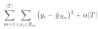 这里∣T∣代表树 T 中叶结点的数量,R_m 代表第 m 个叶结点对应的矩形(预测器空间的子集),yhat_Rm 是 Rm 的预测值,即 Rm 中训练样本预测值的均值(或分类树中的模式响应)。调整参数 α 控制子树复杂度之间的权衡,对训练数据进行拟合。当 α= 0 的时候,子树 T 等同于 T_0。当α的值增长时,构建具备多个子结点的树需要付出代价,这样,要想得到更小的子树,上述公式将达到最小化。我们可以使用某种交叉验证方法选择剪枝参数 α 。