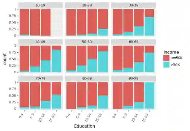 (ggplot(df_train_set, aes(x = "Education", fill = "Income"))+ geom_bar(position="fill")+ theme(axis_text_x = element_text(angle = 60, hjust = 1))+ facet_wrap('~AgeGroup'))