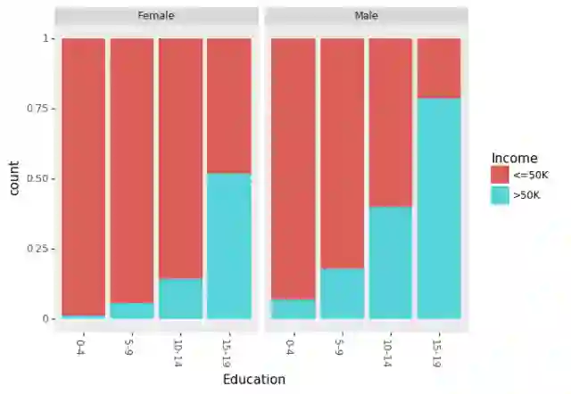 (ggplot(df_train_set, aes(x = "Education", fill = "Income"))+ geom_bar(position="fill")+ theme(axis_text_x = element_text(angle = -90, hjust = 1))+ facet_wrap('~Sex'))