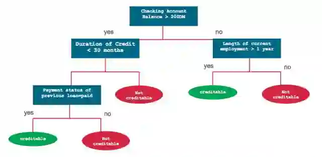 决策树是一种监督学习算法。它适用于类别和连续输入(特征)和输出(预测)变量。基于树的方法把特征空间划分成一系列矩形,然后给每一个矩形安置一个简单的模型(像一个常数)。从概念上来讲,它们是简单且有效的。首先我们通过一个例子来理解决策树。然后用一种正规分析方法来分析创建决策树的过程。考虑一个简单的借贷公司顾客的数据集合。我们给定了所有客户的查询账户余额、信用记录、任职年限和先前贷款状况。相关任务是预测顾客的风险等级是否可信。该问题可以使用下列决策树来解决: