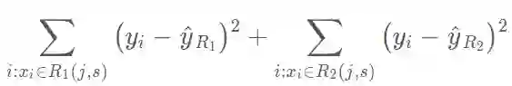 其中 yhat_R1 为区域 R_1(j,s) 中观察样本的平均预测值,yhat_R2 为区域 R_2(j,s) 的观察样本预测均值。这一过程不断重复以搜寻最好的预测器和切分点,并进一步分隔数据以使每一个子区域内的 RSS 最小化。然而,我们不会分割整个预测器空间,我们只会分割一个或两个前面已经认定的区域。这一过程会一直持续,直到达到停止准则,例如我们可以设定停止准则为每一个区域最多包含 m 个观察样本。一旦我们创建了区域 R_1、R_2、...、R_J,给定一个测试样本,我们就可以用该区域所有训练样本的平均预测值来预测该测试样本的值。
