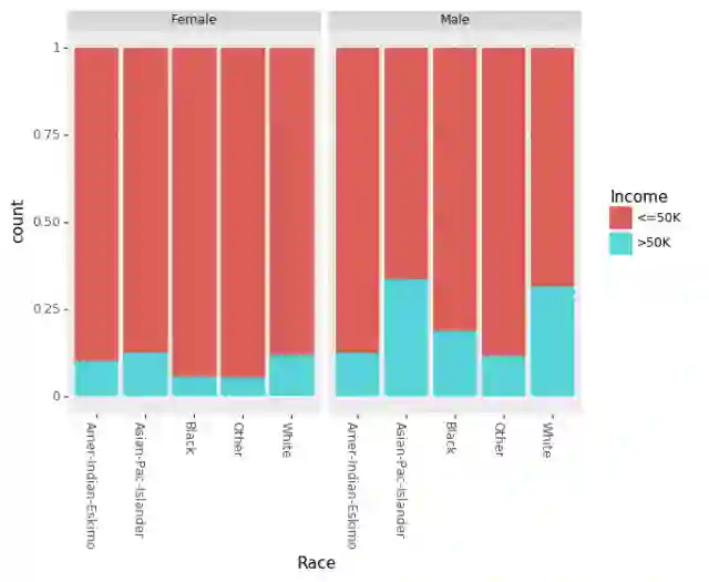 (ggplot(df_train_set, aes(x = "Race", fill = "Income"))+ geom_bar(position="fill")+ theme(axis_text_x = element_text(angle = -90, hjust = 1))+ facet_wrap('~Sex'))