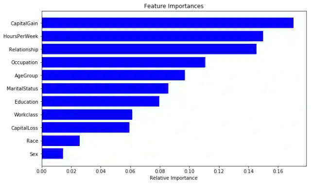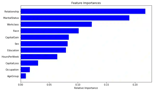 importances = rclf.feature_importances_ indices = np.argsort(importances) cols = [cols[x] for x in indices] plt.figure(figsize=(10,6)) plt.title('Feature Importances') plt.barh(range(len(indices)), importances[indices], color='b', align='center') plt.yticks(range(len(indices)), cols) plt.xlabel('Relative Importance')