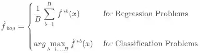 这就叫做袋装(bagging)。注意,聚集(aggregating)在回归和分类问题中可能有不同的均值。当平均预测值在回归问题中的效果很好时,我们将会需要使用多数票决(majority vote):由于分类问题中的聚集机制,整体预测就是在 B 个预测值中最常出现的那个主要类别。