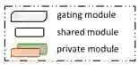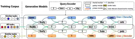 对于每个任务,相应的生成模型由三部分组成:共享模块(shared module)、私有模块(private module)和门控模块(gating module)。共享模块是一个传统的序列到序列模型(seq2seq),旨在学习一般的生成能力。此模块在任务之间共享。私有模块旨在记住任务独特的特性。所有任务的私有模块都是从seq2seq解码器中的同一个多层感知机(Multi Layer Perception, MLP)开始,然后在训练过程中演变成不同的结构。门控模块用于平衡前两个模块的贡献,并且也在任务之间共享。