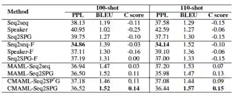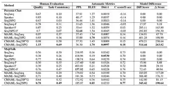 为了验证CMAML的有效性,本文在两个数据集上进行了实验:Persona-chat和Mojitalk。在Persona-chat中,本文把为用户建立对话模型看作是一项任务。在Mojitalk中,本文将使用指定的表情(emoji)生成对话回复视为一项任务。