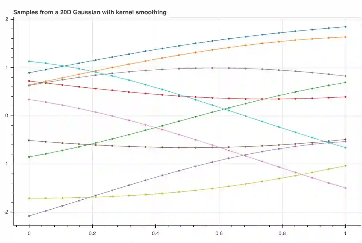 相反,我们需要一些平滑的概念:即如果两个输入点彼此邻近,那么我们期望这些点的函数值是相似的。就我们的模型而言,对用于相邻点的随机变量在它们的联合分布(即高斯协方差)下采样时应该具有相似的值。