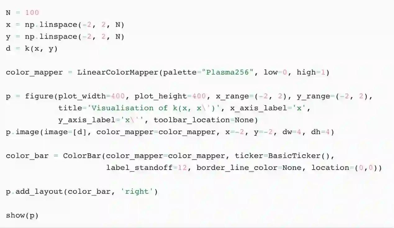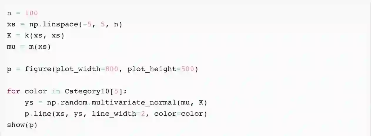 因此,为了得到我们想要的那种平滑性,我们将考虑在xi和xj处绘制两个随机变量yi和yj,来得到它们的协方差cov(yi,yj) = k(xi,xj) ——它们越接近,它们的协方差越高。