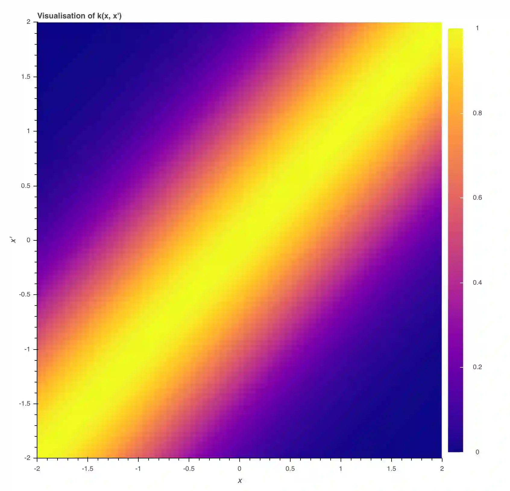 我们可以绘制这个核函数来展示它在x = x’时是最大的,然后随着两个输入的不同开始平滑的下降