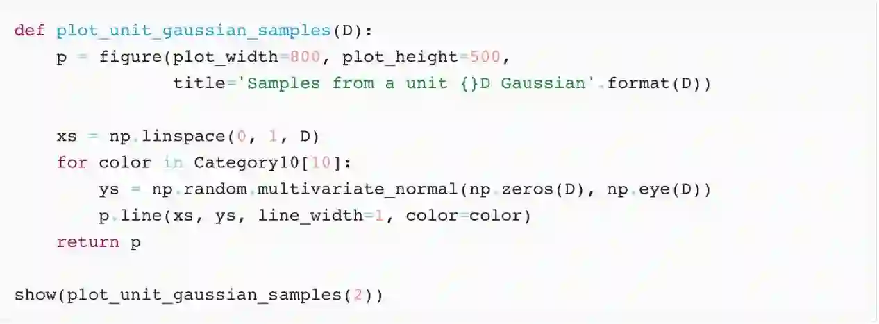 通常它是高度表示概率密度的3D钟形曲线。但是,假如不是表示整个分布,我们只需要从分布中抽样。然后我们将得到两个值,我们可以绘制点d并在它们之间画一条线。
