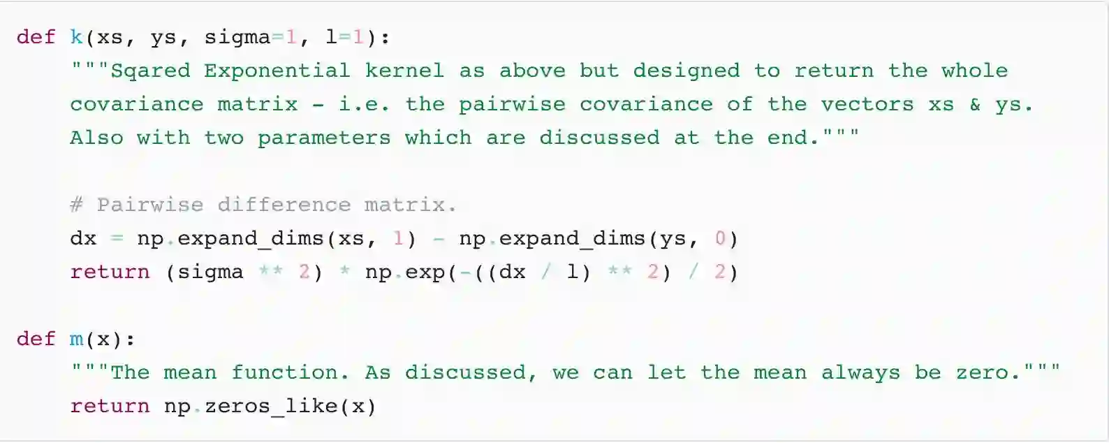 那么如何定义我们的协方差函数呢?这时大量关于核的文献可以派上用场。我们将选择平方指数核(最简单的形式)来达到我们的目的,定义如下: