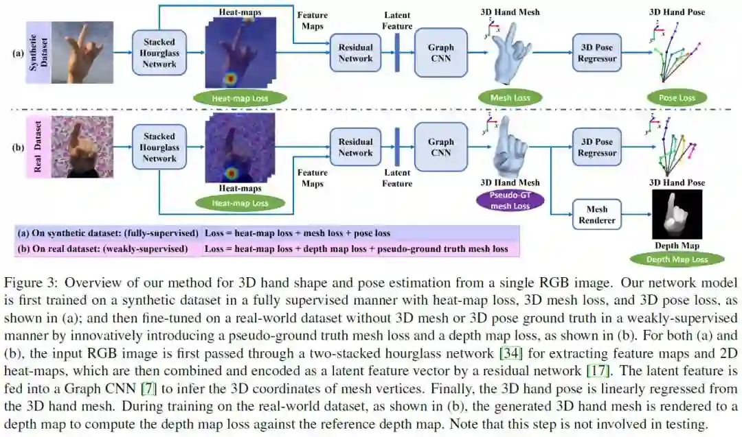 摘要:这项工作解决了一个新颖且具有挑战性的问题,从单一RGB图像估计完整3D手形和姿势。目前对单目RGB图像进行三维手部分析的方法大多只注重对手部关键点的三维位置进行估计,无法完全表达手部的三维形态。相比之下,我们提出了一种基于图卷积神经网络(Graph CNN)的方法来重建一个完整的手部三维网格,其中包含了更丰富的手部三维形状和姿态信息。为了训练具有完全监督的网络,我们创建了一个包含ground truth三维网格和三维姿态的大规模合成数据集。当在真实世界数据集上微调网络时(没有三维ground truth),我们提出了一种利用深度图作为训练弱监督的方法。通过对所提出的新数据集和两个公共数据集的广泛评估,表明我们所提出的方法能够生成准确合理的三维手部网格,与现有方法相比,能够获得更高的三维手部姿态估计精度。
