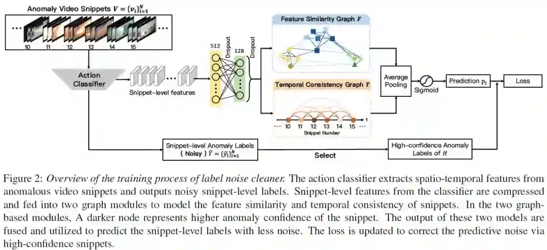 摘要:在以往的工作中,弱标签下的视频异常检测被描述为一个典型的多实例学习问题。在本文中,我们提供了一个新的视角,即在嘈杂标签下的监督学习任务。在这样的观点中,只要去除标签噪声,就可以直接将全监督的动作分类器应用到弱监督异常检测中,并最大限度地利用这些完善的分类器。为此,我们设计了一个图卷积网络来校正噪声标签。基于特征相似性和时间一致性,我们的网络将监控信号从高置信度的片段传播到低置信度的片段。以这种方式,网络能够为动作分类器提供清洁的监督。在测试阶段,我们只需要从动作分类器获得片段预测,而无需任何额外的后处理。使用2种类型的动作分类器对3个不同尺度的数据集进行了大量实验,证明了我们的方法的有效性。值得注意的是,我们在UCF-Crime上获得了82.12%的帧级AUC分数。