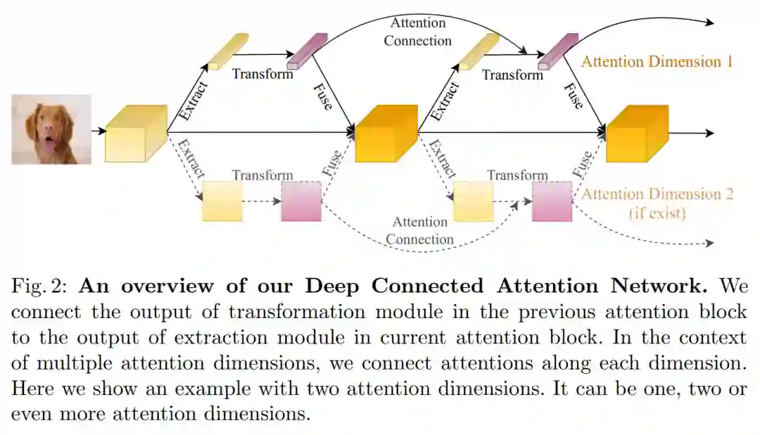 尽管自注意力机制已在许多视觉任务中显示出不错的性能,但它一次只考虑当前的特征。我们表明,这种方式不能充分利用注意力机制。在本文中,我们介绍了深度连接的注意力网络(DCANet),这是一种新颖的设计,可以在不对内部结构进行任何修改的情况下增强CNN模型中的注意力模块。为了实现这一点,我们将相邻的注意力blocks互连,从而使信息在attention blocks之间流动。使用DCANet,可以对CNN模型中的所有注意力模块进行联合训练,从而提高了注意力学习的能力。我们的DCANet是通用的。它不限于特定的注意力模块或基础网络体系结构。