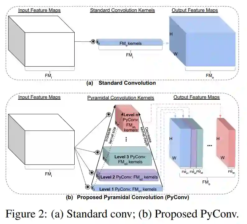这项工作引入了金字塔卷积(PyConv),它能够在多个filter尺度上处理输入。PyConv包含一个kernel金字塔,其中每个level涉及大小和深度不同的不同类型的filters,它们能够捕获场景中不同level的细节。除了这些改进的识别功能之外,PyConv还是高效的,并且按照我们的公式,与标准卷积相比,它不会增加计算成本和参数。而且,它非常灵活和可扩展,为不同的应用提供了大量的潜在网络体系结构。