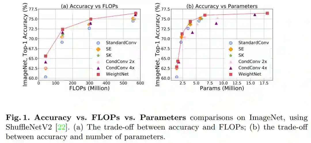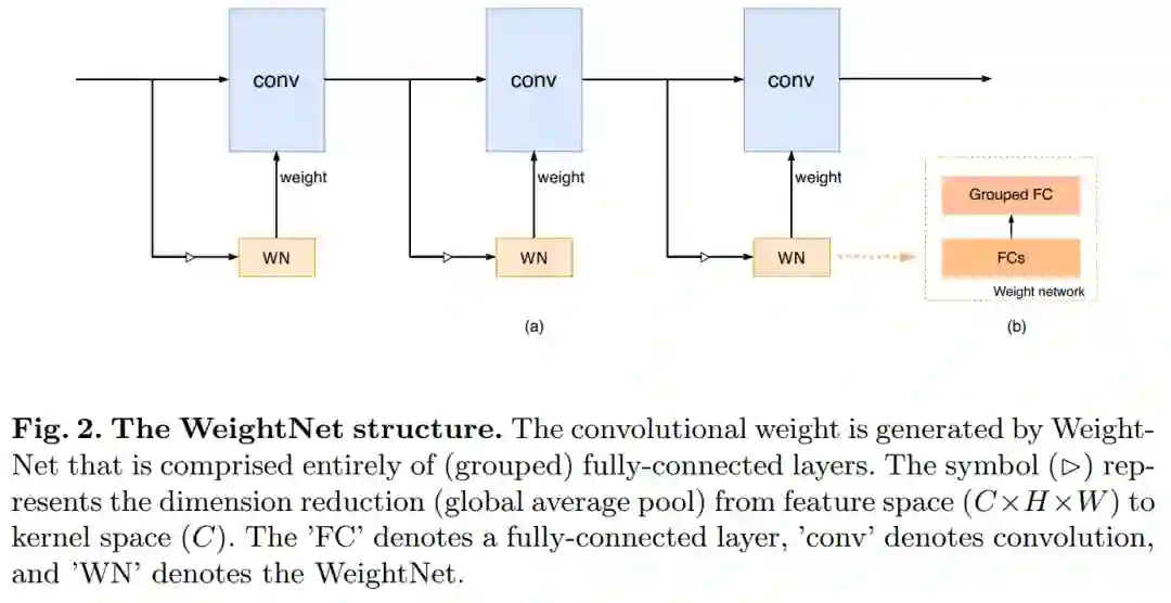 我们提出了一个概念简单,灵活和有效的框架,用于weight 生成网络。我们的方法通常是将两个当前截然不同且极为有效的SENet和CondConv合并到同一weight 空间框架中。称为WeightNet的方法通过将另一组全连接的层简单添加到注意力激活层来泛化这两种方法。我们使用完全由(分组的)全连接层组成的WeightNet直接输出卷积权重。在内核空间而不是特征空间上,WeightNet易于训练并且节省内存。