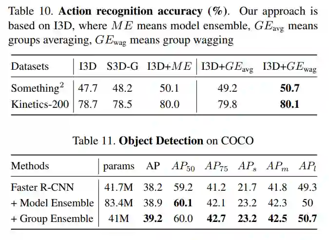 最后,GENet优于大型单一网络,小型网络的标准集成以及CIFAR和ImageNet上的其他最新技术。具体来说,对于ImageNet上的ResNeXt-50,group ensemble将top-1错误减少1.83%。我们还将展示其在行为识别和目标检测任务上的有效性。