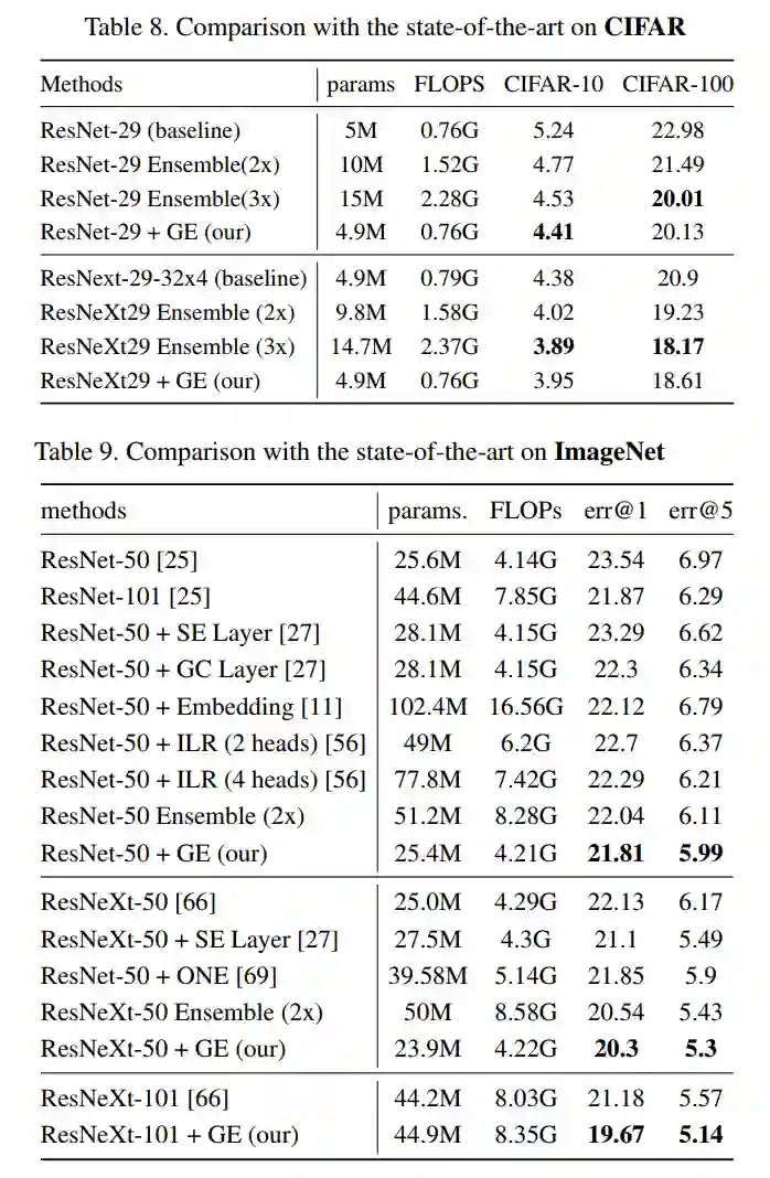 ResNet-50 + GE从原23.54降低至21.81错误率,ResNeXt-50 + GE从原 22.13降低至20.3错误率,还可应用于其他CV任务,如目标检测、行为识别等。