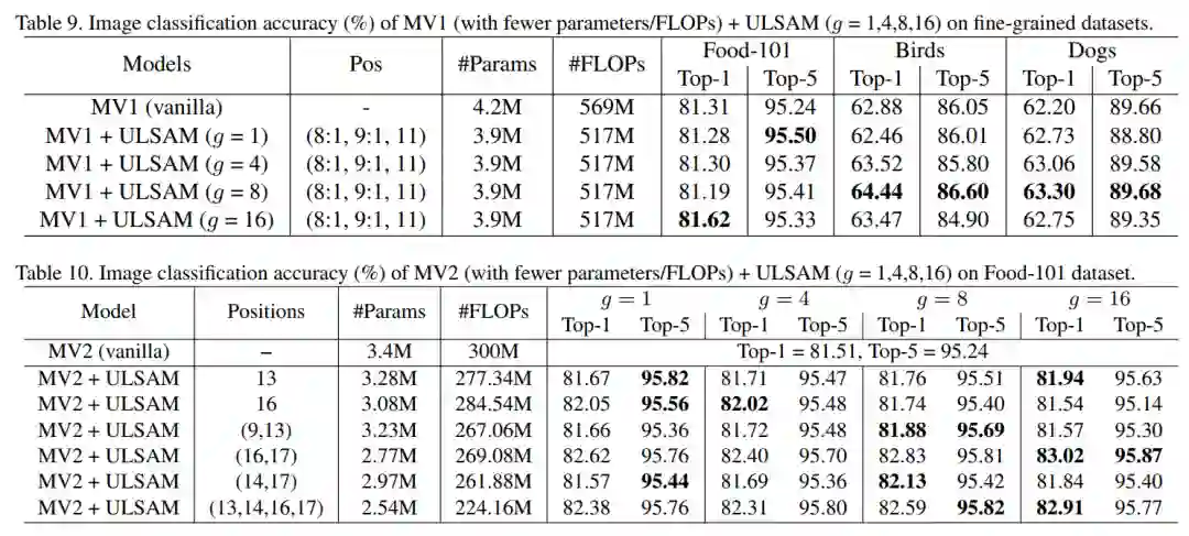 为了显示ULSAM的功效,我们使用MobileNet-V1和MobileNet-V2作为ImageNet-1K和三个细粒度图像分类数据集的主干架构进行了实验。在ImageNet-1K和细粒度图像分类数据集上,我们分别使MobileNet-V2的FLOP和参数计数减少了约13%和约25%,在top-1准确性方面分别提高了0.27%和1%以上。)。