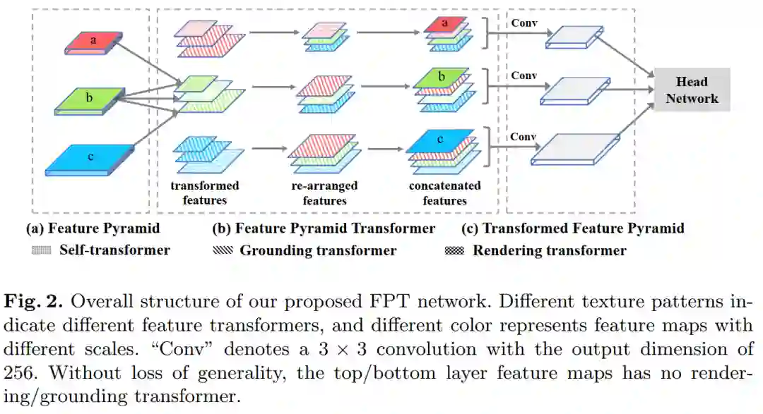 为此,我们提出了一种跨空间和尺度的完全活跃的特征交互功能,称为特征金字塔Transformer(FPT)。通过使用self-level,自上而下和自下而上这三个交互方式的特殊设计的transformers,它将任何特征金字塔转换为相同大小但具有更丰富上下文的另一个特征金字塔。FPT充当通用的视觉骨干,具有合理的计算开销。