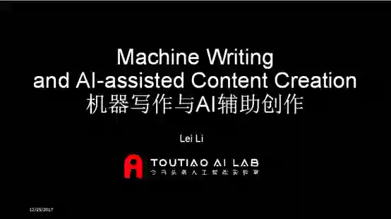 今日头条人工智能实验室技术总监李磊作为获奖团队代表在大会现场做了题为“机器写作与AI辅助创作”的报告。报告全文如下: