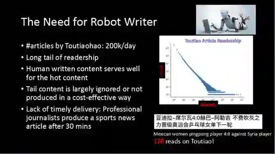 首先是机器写作。为什么要写作机器人呢?这里有一幅图表,它画的是在我们的平台上发文章被阅读的频次,以及不同频次所对应的文章数量。可以看到它是一条直线,有大部分的文章,是阅读次数都比较少,有少量的文章被阅读的次数非常非常多。这是在很多领域都非常常见的一个现象。