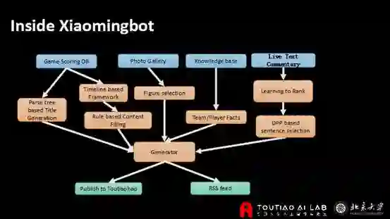 我们从去年6月开始做了一个机器人Xiaomingbot。一开始是做奥运会的赛事文章撰写。它包涵三方面的输入——实时比分,实时图片数据,以及热门比赛的文字直播。我们的机器人将这三方面融合起来,最后生成对应的文章。
