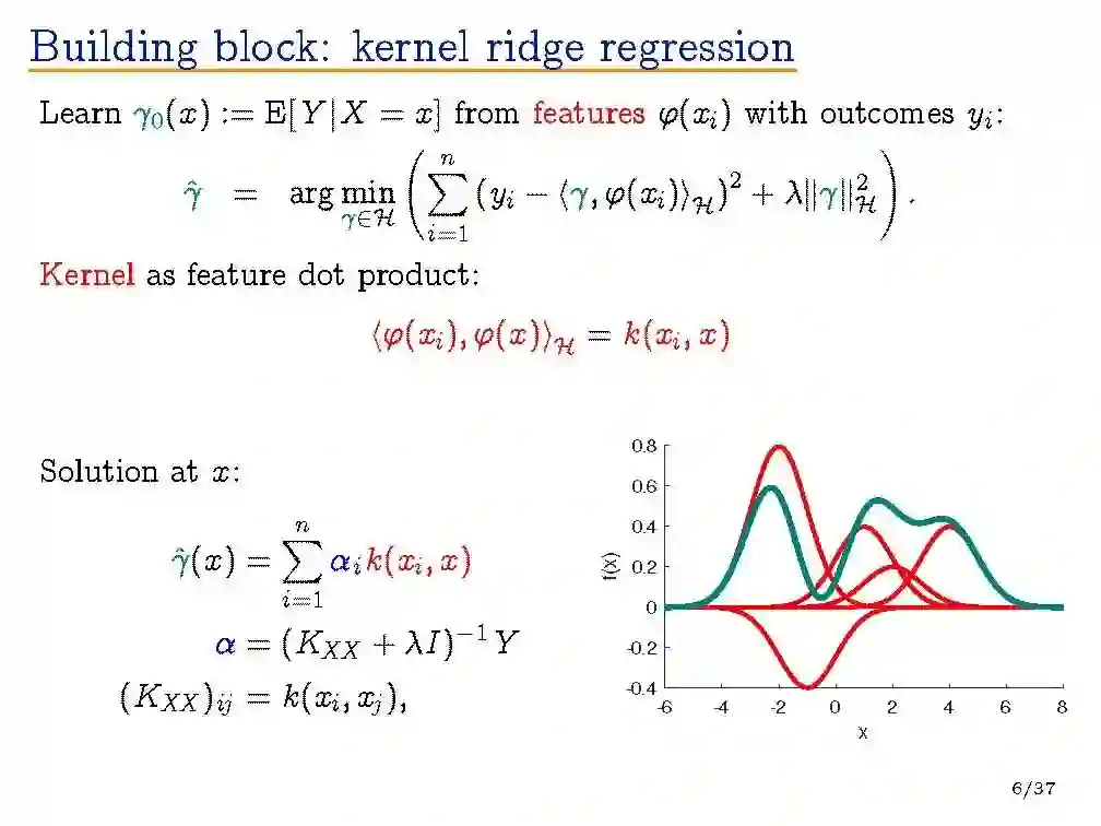 一个基本的因果建模任务是在观察到的协变量X存在的情况下,预测干预(或治疗)D= D对结果Y的影响。我们可以通过边缘化条件平均值E(Y|X,D)除以P(X)的估计得到平均治疗效果(ATE:干预D的预期结果)。更复杂的因果关系问题需要更细致的处理。例如,被治疗者的平均治疗(ATT)处理的是一个反事实:对接受d治疗的亚群体进行d'治疗的结果是什么?在这种情况下,我们必须在条件分布P(X\d)上边缘化\gamma,这对连续多变量d来说是一个挑战。许多附加的因果问题要求我们在条件分布上边缘化,包括条件ATE、中介分析、动态治疗效果,以及使用代理变量对未观察到的混杂因素进行校正。我们在非参数设置中使用核方法来解决这些问题,核方法可以应用于非常一般的处理D和协变量X(连续多元,字符串,组,…)我们通过核脊回归学习\gamma,并使用核条件均值嵌入对条件分布进行边缘化,这可以被认为是两阶段最小二乘的推广。我们在一般平滑假设下提供了强大的统计保证,并提供了直接而稳健的实现(几行代码)。