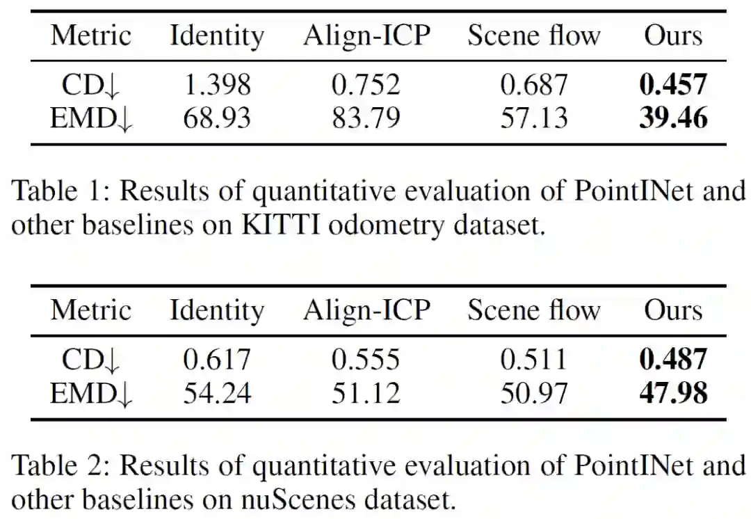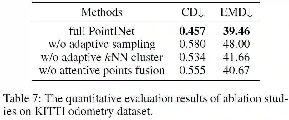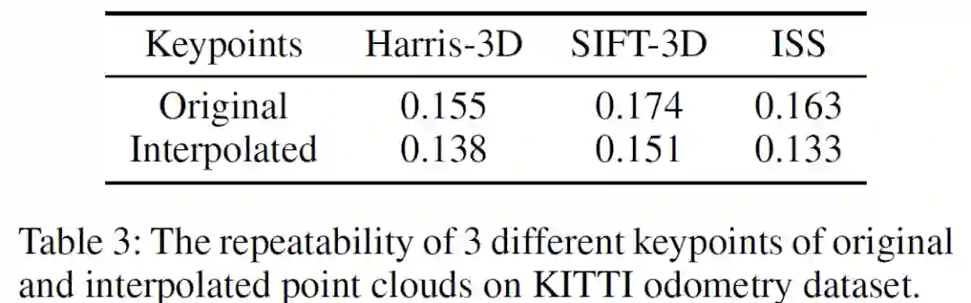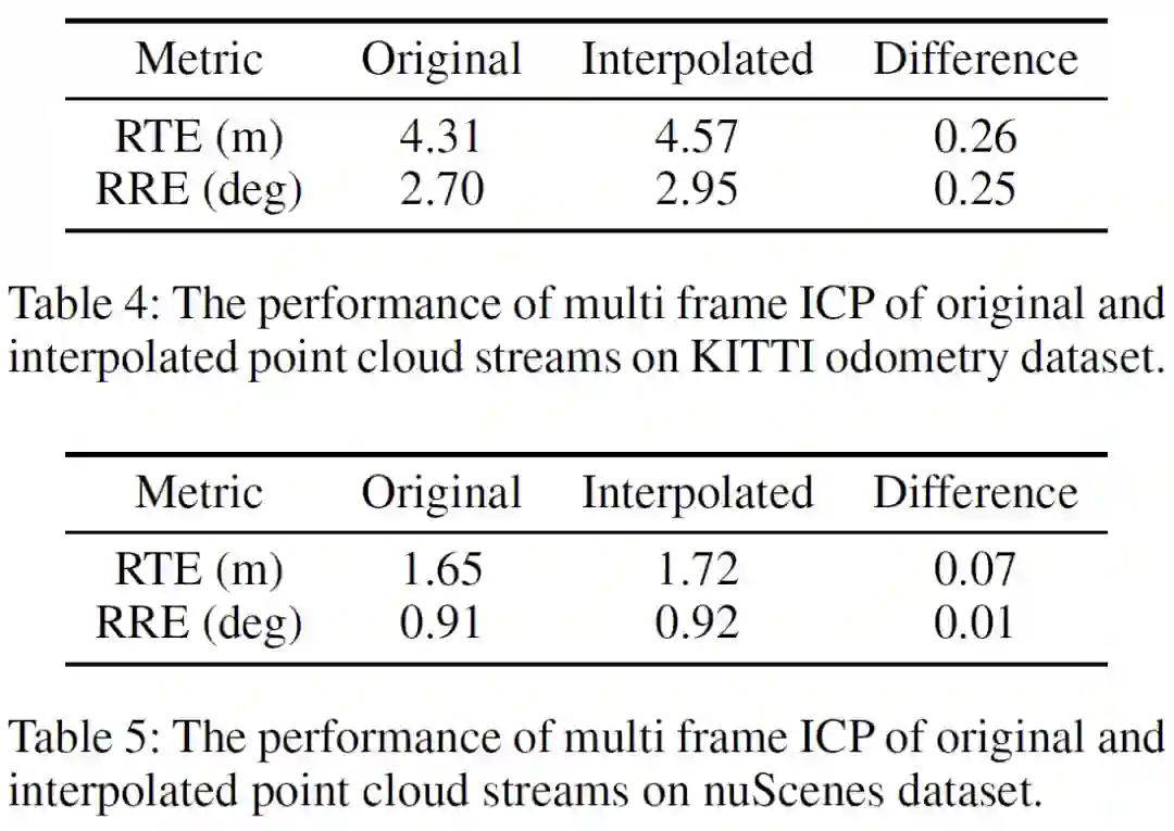 此外,为了进一步验证生成点云的质量,我们还在两个应用上面来比较插帧点云和真实点云的性能,分别是Keypoint detection(关键点检测)和Multi-frame ICP(多帧ICP算法)。下面点表格展示了实际算法应用的结果,可以看到使用插帧的点云与真实的点云的结果很接近,这从侧面反映了插帧所获得的点云的质量和相似度。