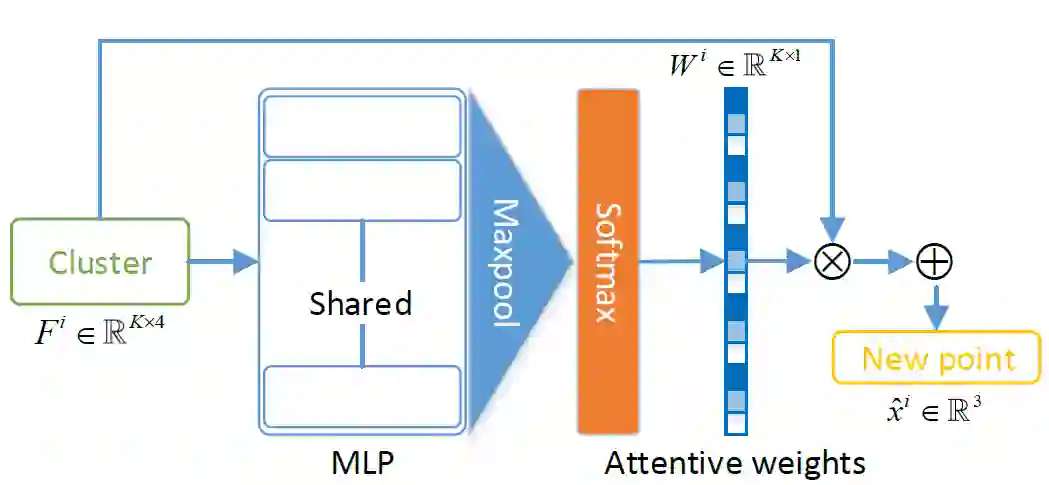 我们首先将这个特征图送入到一个Shared-MLP中来提取高维的特征,然后用一个max-pool以及Softmax函数来得到注意力权重,这个注意力权重是对于一个聚类中的每一个近邻点定义的,即每个点都会对应一个权重,理论上这个注意力机制可以给更符合最后的中间帧点云中的点更高的权重,而其他不重要的点的权重则更低,我们利用注意力权重对这K个近邻点进行加权求和以得到最后的生成的点云中的点。