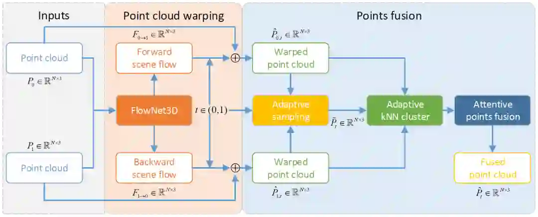 网络的主体部分主要由两个部分组成,分别是Point cloud warping (点云变换)和Points fusion (点融合)。其输入为两帧连续的点云以及给定一个位于(0,1)之间的时间点,输出则为网络所预测的在给定时间点的中间帧点云。网络的总体实现受到了视频插帧算法的很大的启发,并依据点云的特征来设计具体的网络结构。