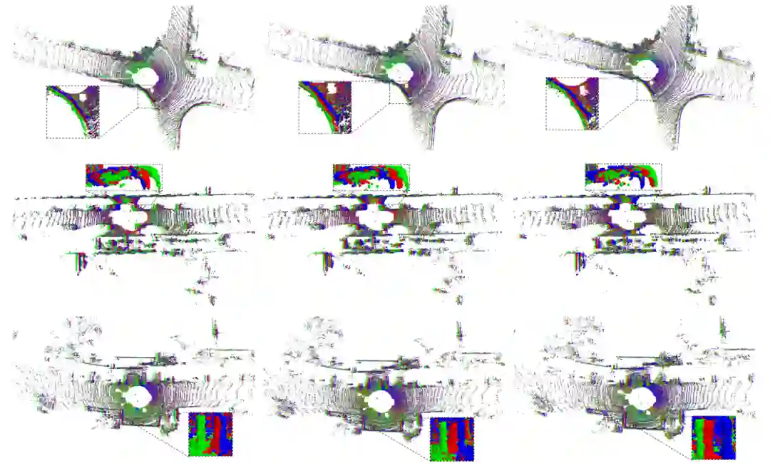 为了验证我们的方法,我们在KITTI odometry dataset和NuScenes dataset两个数据集上进行了实验分析。由于缺乏真值的高帧率点云,在训练和定量分析的过程中,我们首先把10Hz(20Hz)的点云下采样到2Hz(4Hz)的点云,并用低帧率的点云作为插帧前的点云,原始的相对高帧率的点云作为真值的插帧点云。在可视化的验证过程中,我们直接使用了在低帧率的点云上训练的模型对相对高帧率的点云(10~20Hz)进行插帧。从上面所展示的demo视频中也可以看到,模型的总体的泛化性较好,插帧也得到了有效的结果。下图展示了点云插帧的一个可视化展示,从左到右分别是时间t在0.25,0.50和0.75时的结果,蓝色、红色和绿色的点云分别是第一帧,中间帧和第二帧。我们也放大了一些区域来展示细节。