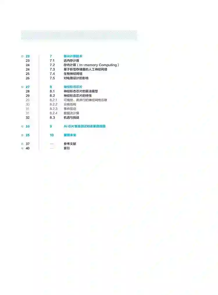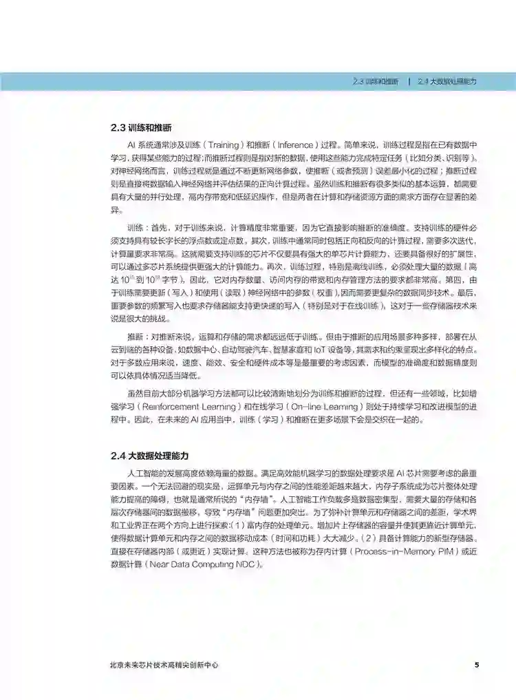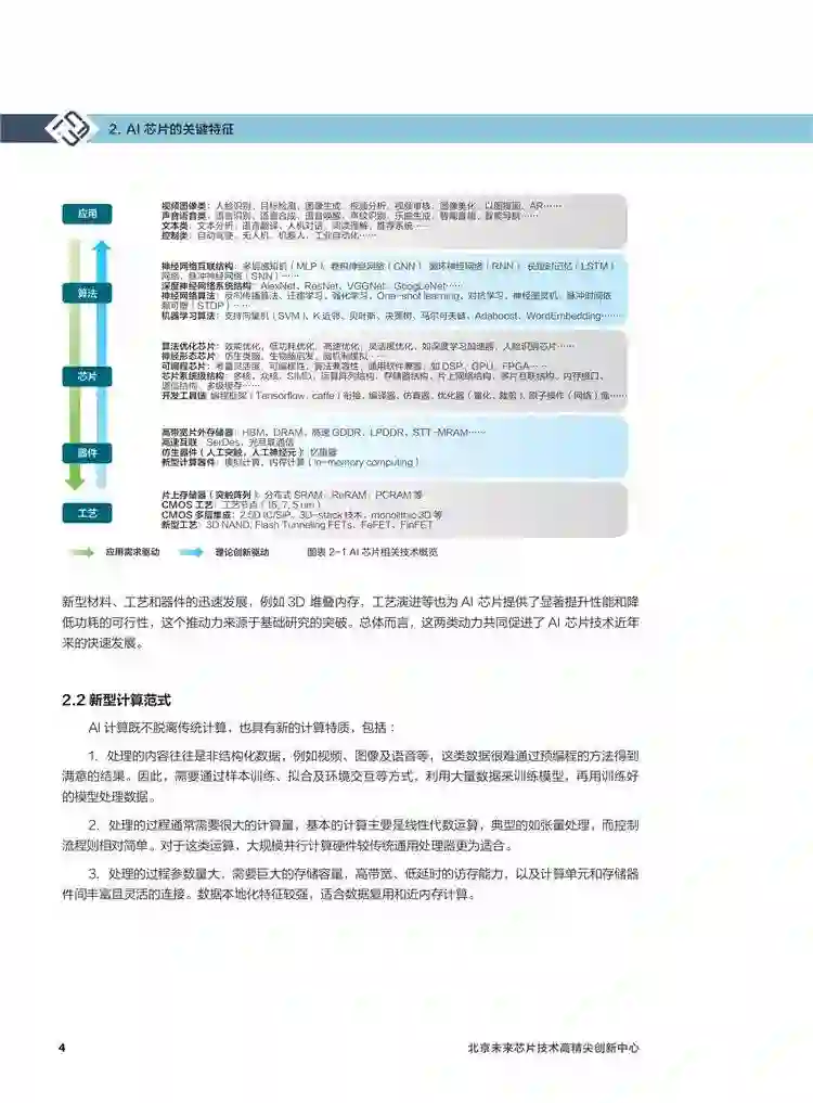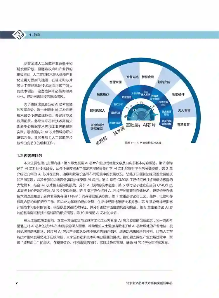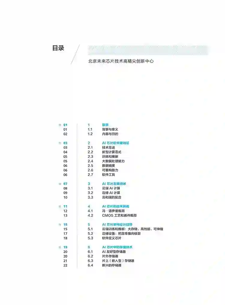 整个《白皮书》总共分为10个章节,第一章节首先对芯片发展的背景做了一个交代,然后从多个维度介绍了AI 芯片的关键特征,在第三章介绍了AI芯片的发展现状;第四章从冯·诺伊曼瓶颈和CMOS工艺以及器件瓶颈分析了AI芯片的技术挑战。