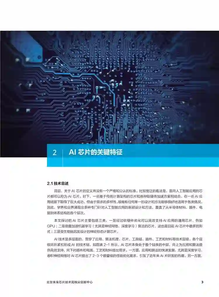 人工智能( Artifical Intelligence,英文缩写为AI,是研究、开发用于模拟、延伸和扩展人类智能的理论、方法、技术及应用系统的一门科学技术。人工智能的本质是对人类思维过程的模拟。从1956年正式提出“人工智能”概念算起,在半个多世纪的发展历程中,人们一直在这一领域进行长期的科学探索和技术攻坚试图了解能的实质,和任何曾经处于发展过程中的新兴学科一样,人工智能早期发展并非一帆风顺,受到多方质疑,不断经历起伏。近些年,大数据的积聚、理论算法的革新、计算能力的提升及网络设施的演进,使得持续积累了半个多世纪的人工智能产业又一次迎来革命性的进步,人工智能的研究和应用进入全新的发展阶段。当前,人工智能正逐渐发展为新一代通用技术,加快与经济社会各领域渗透融合,已在医疗、金融、安防、教育、交通,物流等多个领域实现新业态、新模式和新产品的突破式应用,带动生产流程、产品、信息消费和服务业的智能化、高附加值转型发展。人工智能已处于新科技革命和产业变革的核心前沿,成为推动经济社会发展的新引擎。实际上,人工智能产业得以快速发展,无论是算法的实现、海量数据的获取和存储还是计算能力的体现都离不开目前唯一的物理基础一芯片。可以说,“无芯片不AI",能否开发出具有超高运算能力、符合市场需求的芯片,已成为人工智能领域可持续发展的要因素。