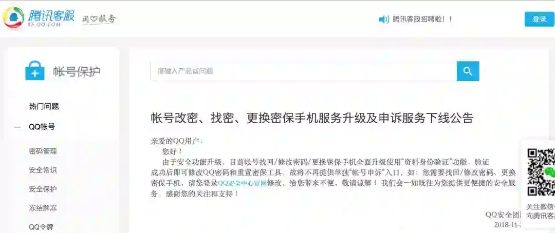 新榜讯 近日,腾讯发布《帐号改密、找密、更换密保手机服务升级及申诉服务下线公告》称:由于安全功能升级,目前帐号找回/修改密码/更换密保手机全面升级使用“资料身份验证”功能,验证成功后即可修改QQ密码和重置密保工具,将不再提供单独“帐号申诉”入口,如需找回/修改密码、更换密保手机,可登录QQ安全中心官网修改。