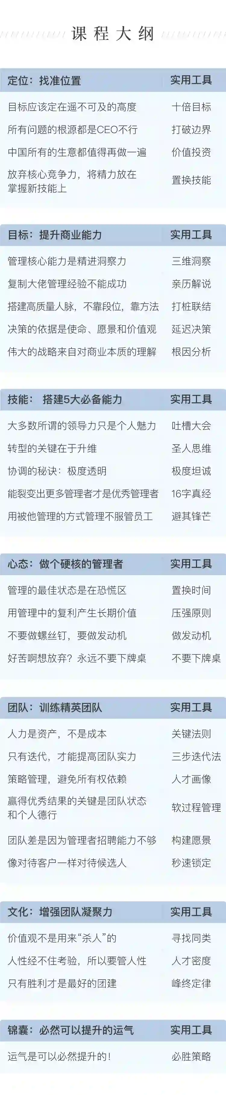课程中姜老师将自己过去10年在硅谷及国内的管理实践经验,以及跟4000多位中国顶尖的CEO/CFO、600多位投资人交流的商业和人性的总结全盘分享给大家。