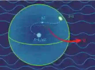 冯芒和他的同事使用一个原子比特进行了量子Landauer 准则的测试,原子比特的状态可以用所谓的Bloch 球(绿线)上的一点来表示。在实验开始时,原子以相等的几率进入到两个内态中的一个态,它相当于Bloch 球的中心,并且具有最大熵kBln2。然后,研究人员通过将原子比特与原子的振动运动(作为热沉——蓝色区域)耦合,部分地擦除该比特。为简单起见,这里所示的擦除是完整的:原子量子比特终止于纯量子态(Bloch 球表面上的一个点),在此它的熵为零
