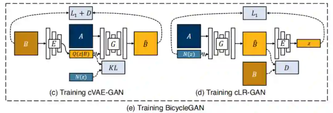 BicycleGAN 结合了 cVAE-GAN 以及 cLR-GAN 来约束输出和潜层编码的双射一致性,其中 cVAE-GAN 在生成器中加入了目标域图像 B 的潜层编码信息来辅助图像翻译,并通过 KL 损失强迫潜层信息满足高斯分布从而最终在测试时直接从高斯分布中采样即可生成多样的输出结果。