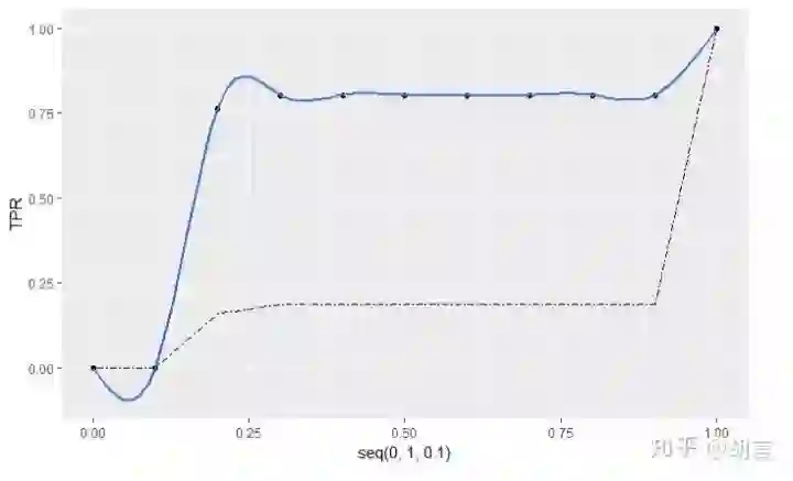 geom_line(mapping = aes(x=seq(0,1,0.1),y=FPR),linetype=6)