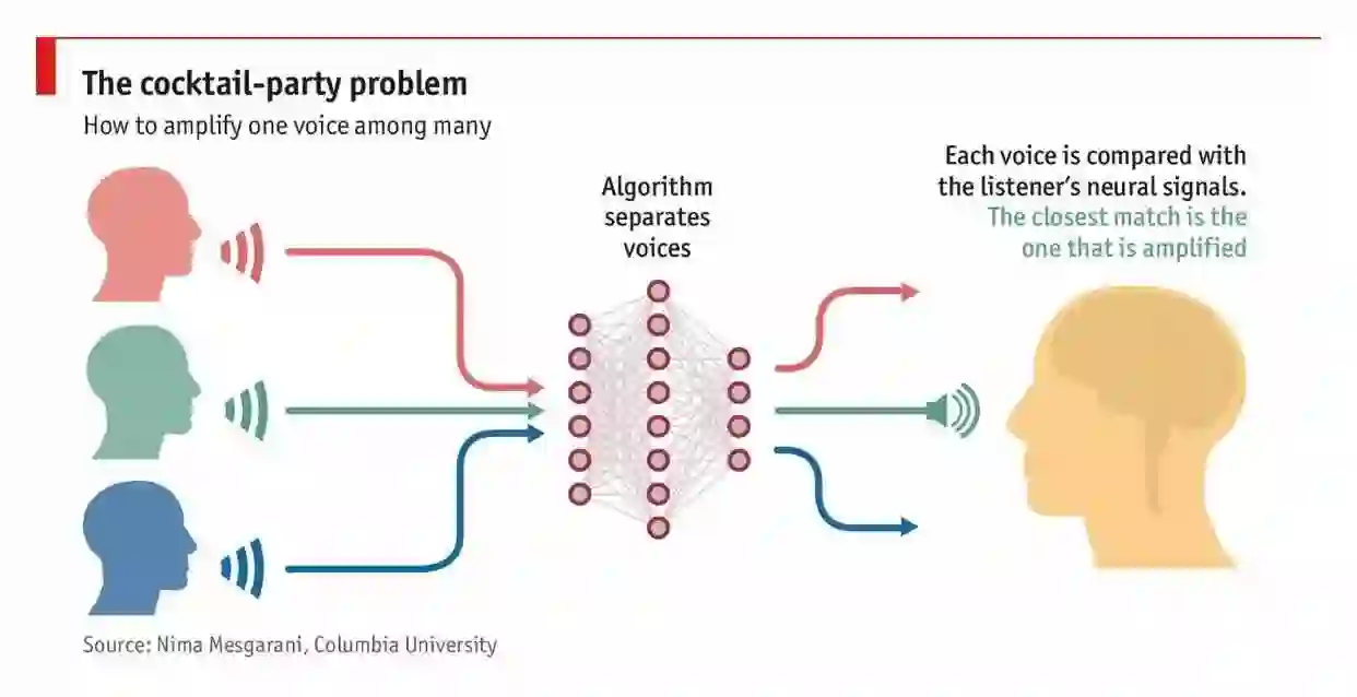 因此,大脑非常善于解决问题,电脑也是如此。例如,助听器的一个问题是它会放大所有传入的声音。当你想在像聚会那样嘈杂的环境中关注一个人时,这就提供不了什么帮助。哥伦比亚大学的 Nima Mesgarani 正在研究一种方法来区分你想要听的人。这个想法是,一种算法将区分同时说话的不同声音,创建一个声谱图,或者说是一种对每个人的说话的声音频率的可视表示。然后当助听器的佩戴者专注于一个特定的对话者时,它观察大脑中的神经活动,这个活动被创建为另一个声谱图,两个声谱图中相匹配的声音会被放大(见图)。