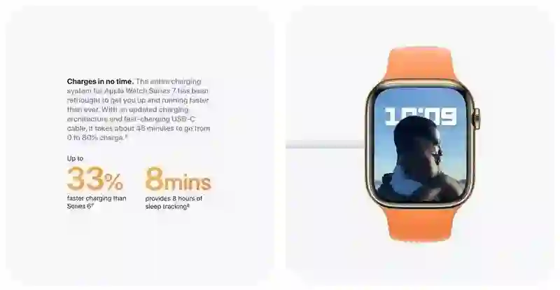 Apple Watch Series 7包括一个新的充电架构,这使得它的充电速度比Series 6快33%,45分钟内可从0充电到80%。 但要具备快速充电功能,需要一根新的USB-C充电线,这根线包括在手表的包装盒中,也可以单独销售的,但到目前为止,苹果还没有提供快速充电所需电源适配器瓦数的细节。 苹果不再在Apple Watch的包装盒中附带电源适配器,因此用户需要自己准备电源适配器。 在今天发布的一份新的支持文件中,苹果公司透露,其任何额定功率为18瓦或更高的USB-C电源适配器都将支持新手表的快速充电。此外,额定功率为5瓦或更高的第三方USB-C适配器只要支持USB Power Delivery(USB-PD)协议,即可实现快速充电。 苹果公司表示,快速充电在阿根廷、印度或越南都不能使用,但该公司没有提供这一限制的原因。