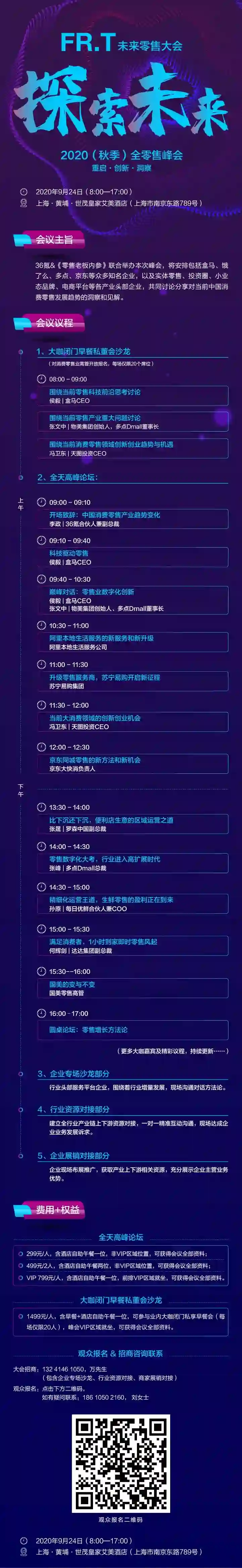 2020年9月24日,36氪&零售老板内参,将在上海世茂皇家艾美酒店,举办「探索未来·2020(秋季)全零售峰会」。届时,盒马、饿了么、苏宁、京东、生鲜零售、便利店、同城零售等各类产业代表,将和全行业一起,探讨2020年零售业创新的成果和未来趋势。
