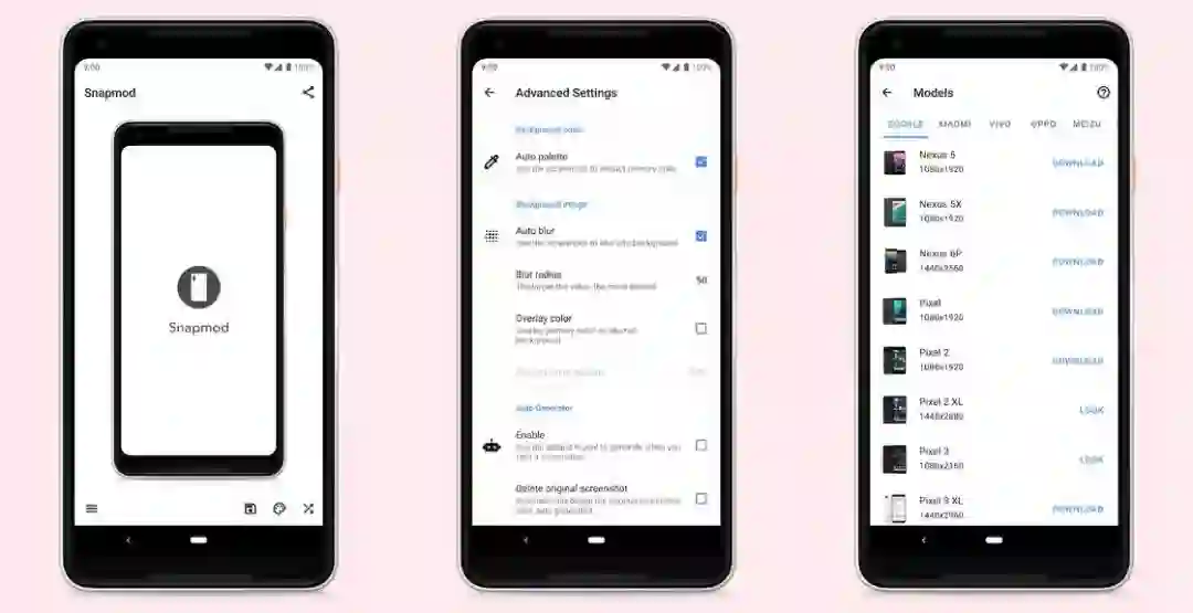 对那些想要美美地分享「带壳的」屏幕截图的小众用户而言,今年上架的 Snapmod 是个难得的惊喜:论界面设计,颇有 Material Design 2 味道的 Snapmod 要比陈旧的 Screener 和久未更新的带壳截图更加现代;论功能特性,它不仅提供带壳截图任务中常常需要用到的背景自动取色、模糊、换壳等等功能,还支持曾被带壳截图作为「杀手锏」功能的截屏自动套壳,省时省力;论机型适配,它覆盖了从 OPPO、vivo、华为、小米到一加、诺基亚、魅族、锤子再到谷歌、三星、Essential 等主流手机品牌的热门机型,并且还在不断进行扩充适配。