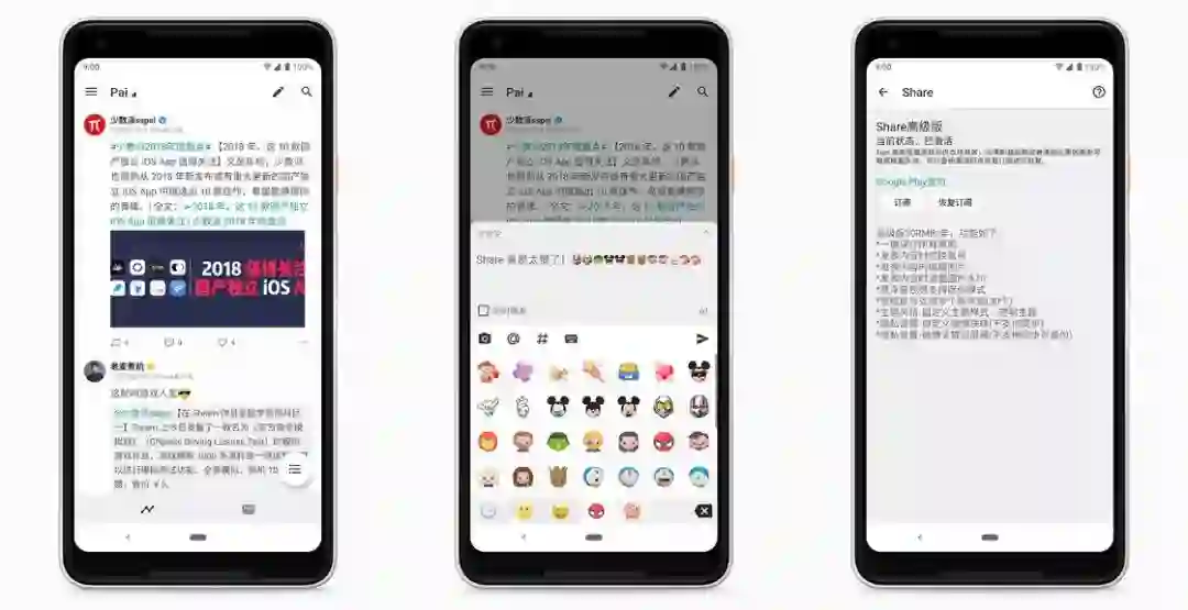 但最重要的一点在于,在健康的付费模式支持下,Share 在过去这一年里一直保持着较高的更新频率,不断完善微博浏览功能和浏览体验的同时,一些微博官方客户端中的新东西(如圣诞老人、复联等热门表情)Share 几乎也都能在第一时间进行跟进——付费制度似乎在某种程度上支撑起了这款第三方微博客户端的不断更新和迭代,加入高级功能订阅后的 Share 找到了更加健康的生存模式,走得也是越来越好。