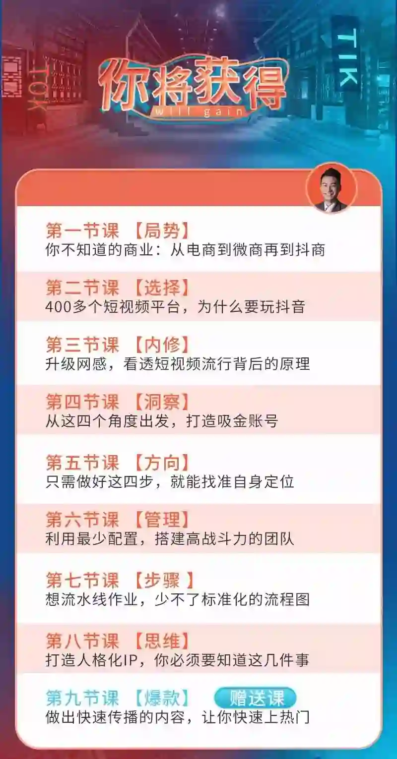 他将这些年孵化500万粉丝抖音矩阵、以及指导10000多名学员在抖音变现的实战经验,融会贯通成这门视频课《抖音必修赚钱课,8大模块助你找准定位,赚到第一桶金》,帮助你把抖音变成你的赚钱技能!